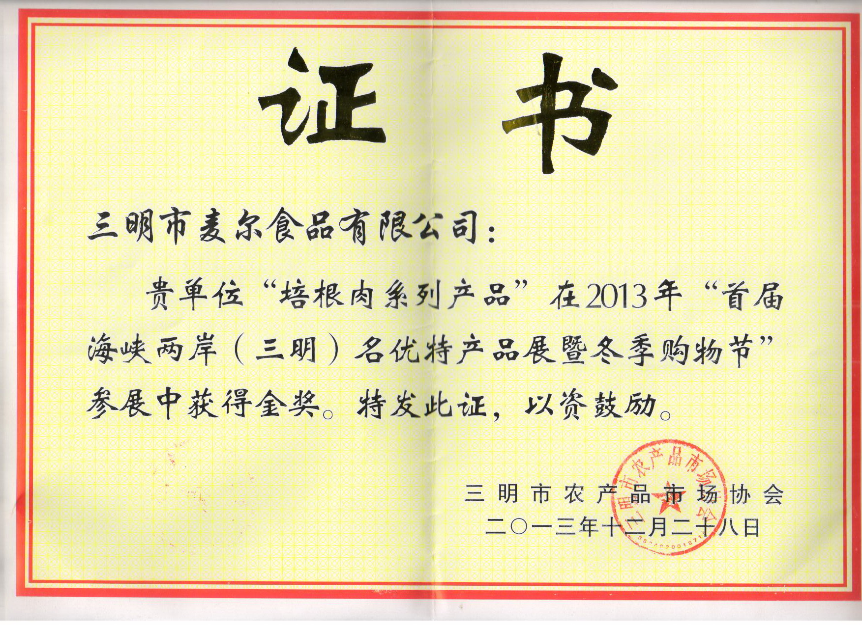 2013年12月14日—23日,三明市農(nóng)產(chǎn)品市場協(xié)會 在下洋廣場舉辦“首屆海峽兩岸(三明)名優(yōu)特產(chǎn)品暨冬季購物節(jié)”活動。在參展會上,我司參展的培根、牛仔骨、豬頸肉、咸豬手、脆口條等系列產(chǎn)品受到顧客的好評,在三明市農(nóng)產(chǎn)品市場協(xié)會組織的評審中榮獲金獎。